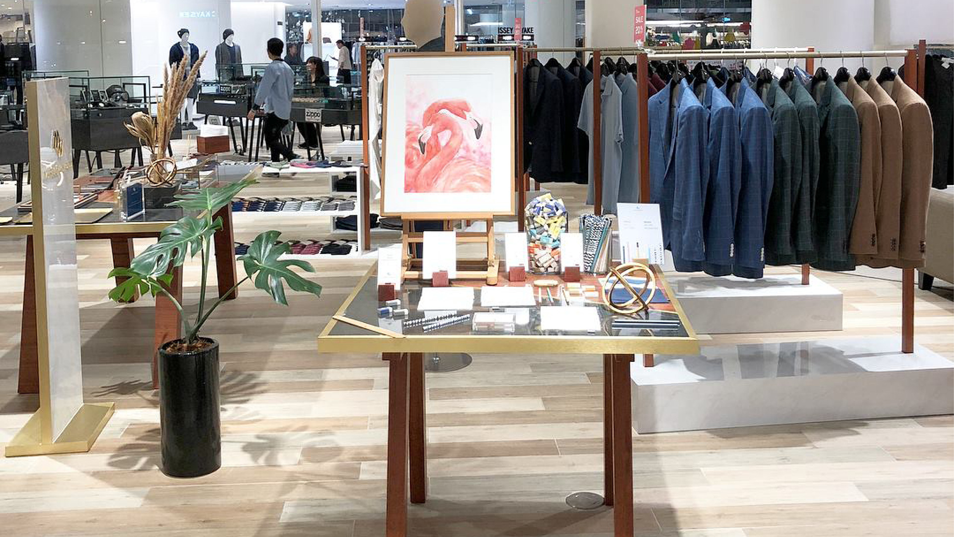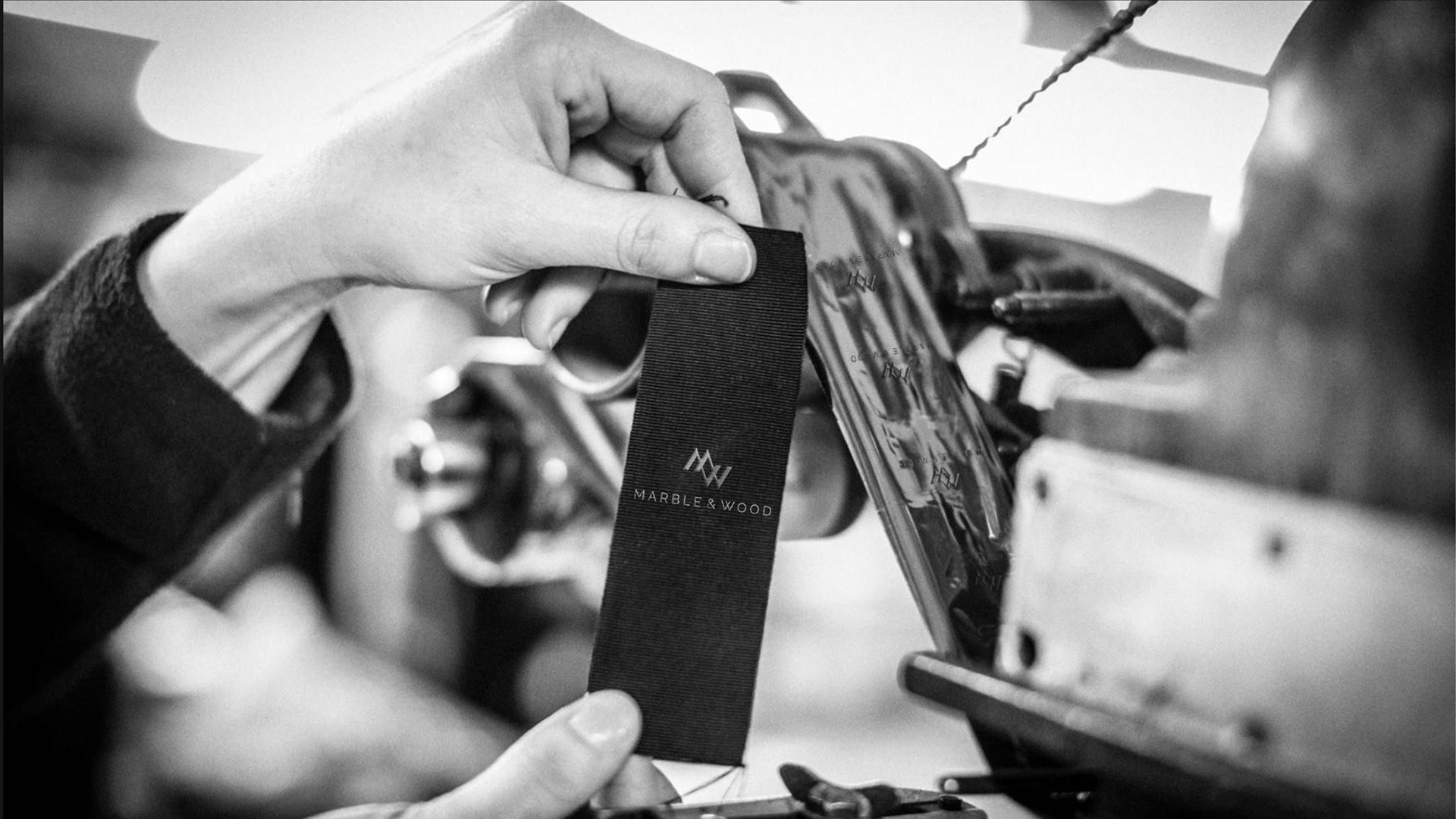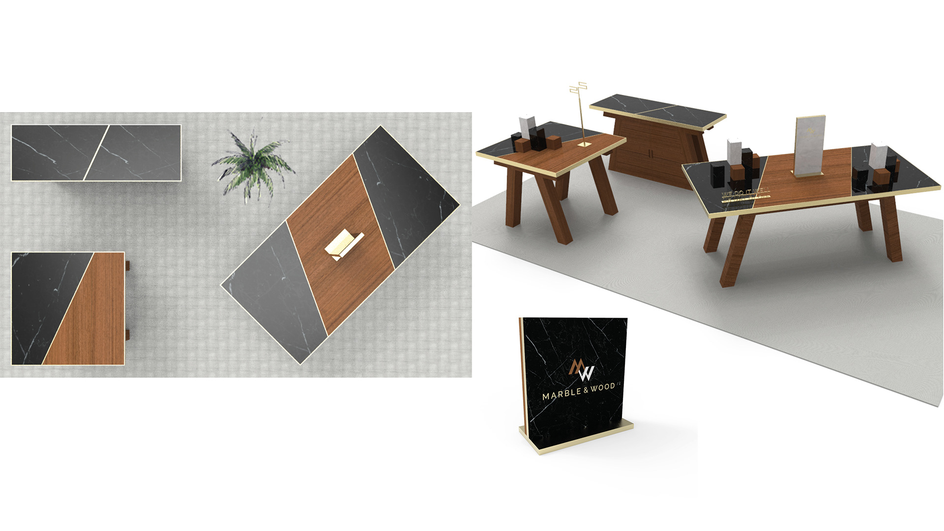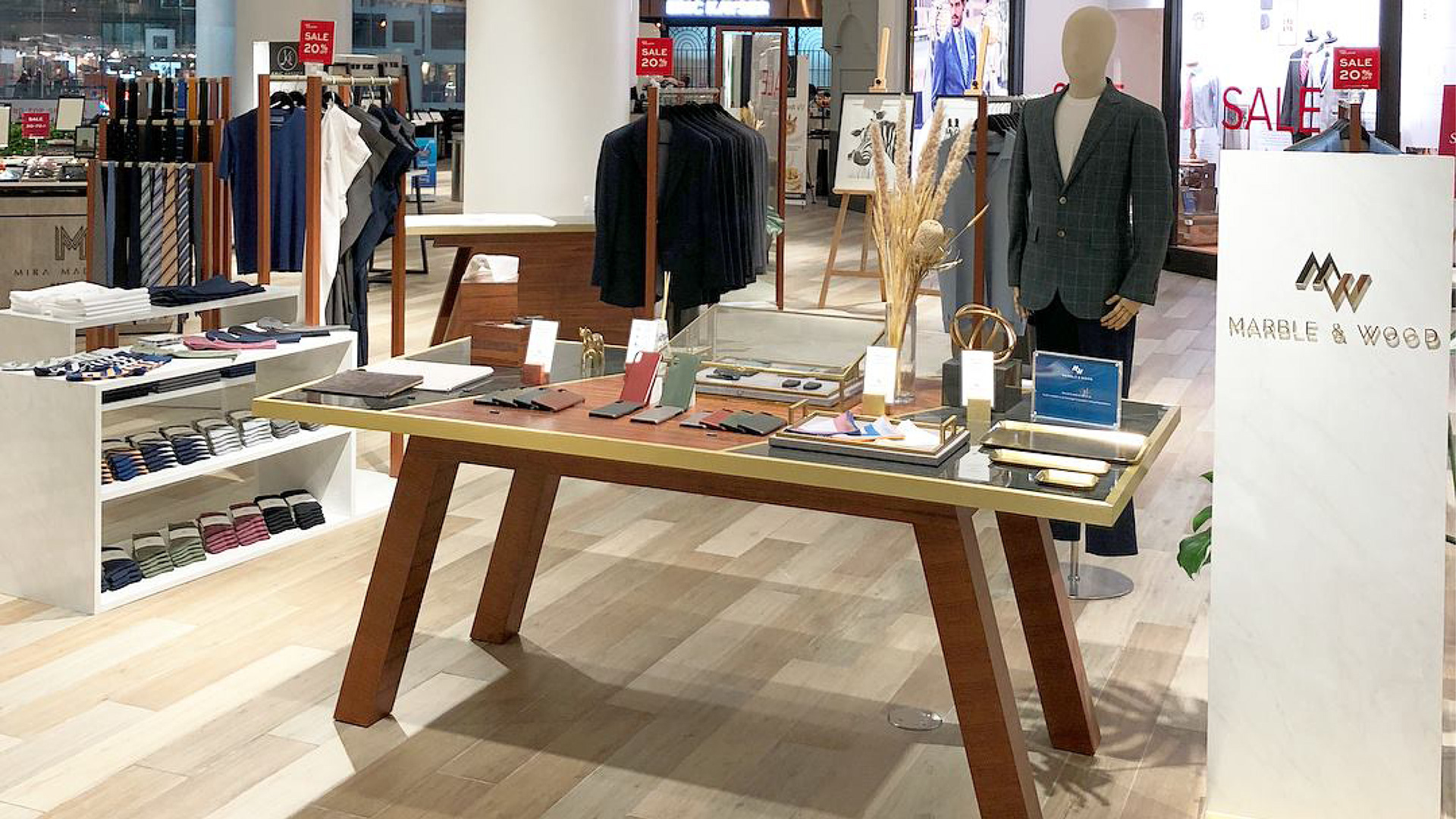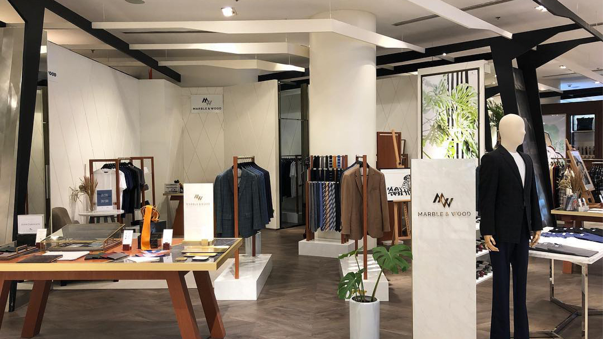 Marble & Wood gentlemen fashion branding start with logo, collaterals, shop pop-up design furniture and signage